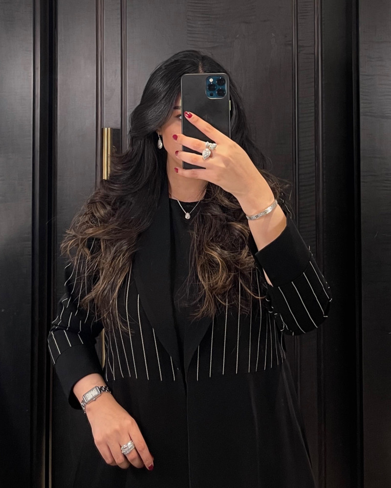 عباية بقصة رسمية ، قماش كريب اسود سادة. - كريب مخطط باللون الابيض